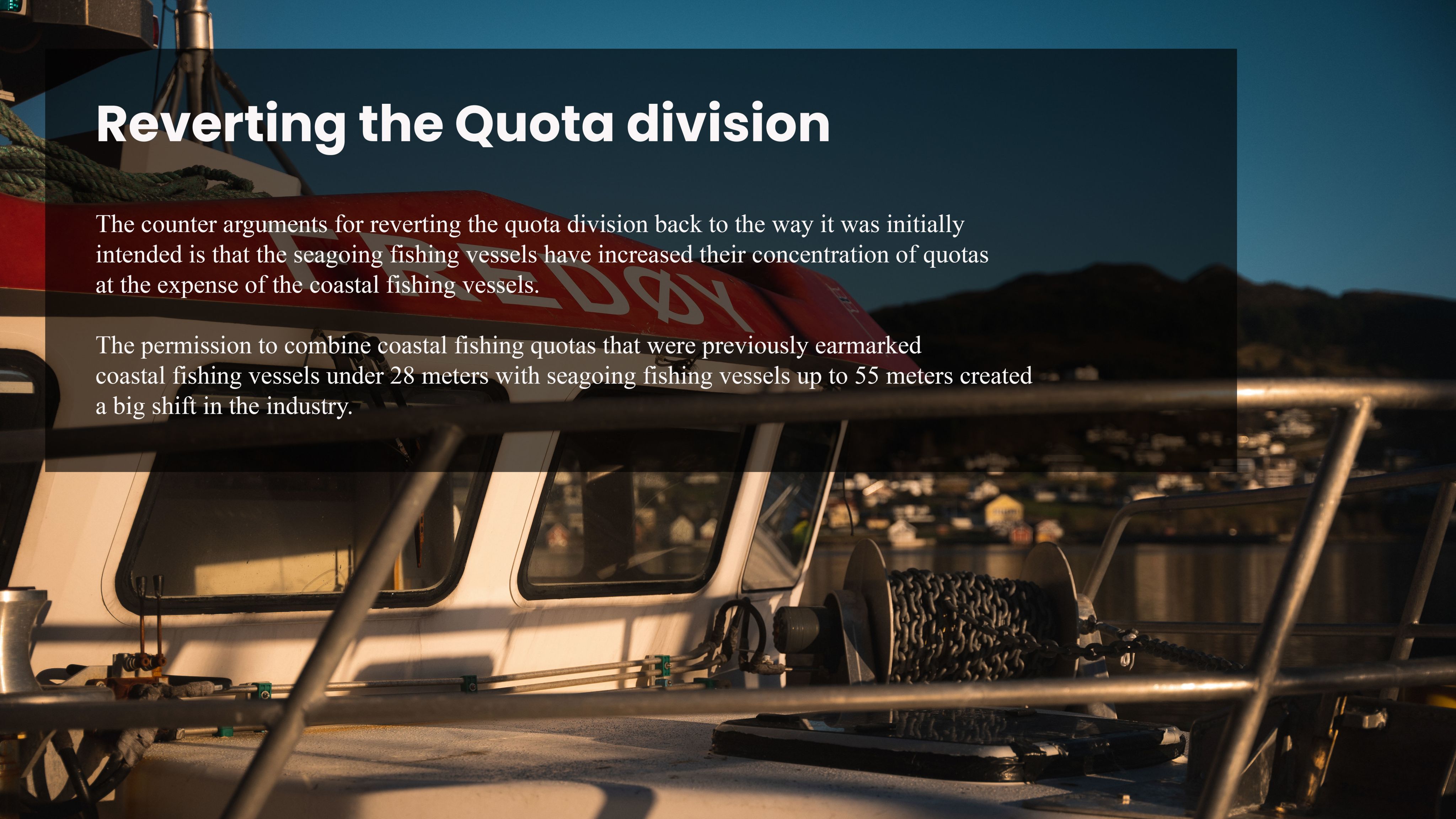 The opinions about the quota system are divided. Many coastal fishermen believe that the concentration of quotas has gone too far, and much further than intended by the politicians. The high entry prices for buying a quota also makes it difficult for newcomers to become fishermen. Others want to keep the structure as it is today since fewer and bigger boats give better profitability.