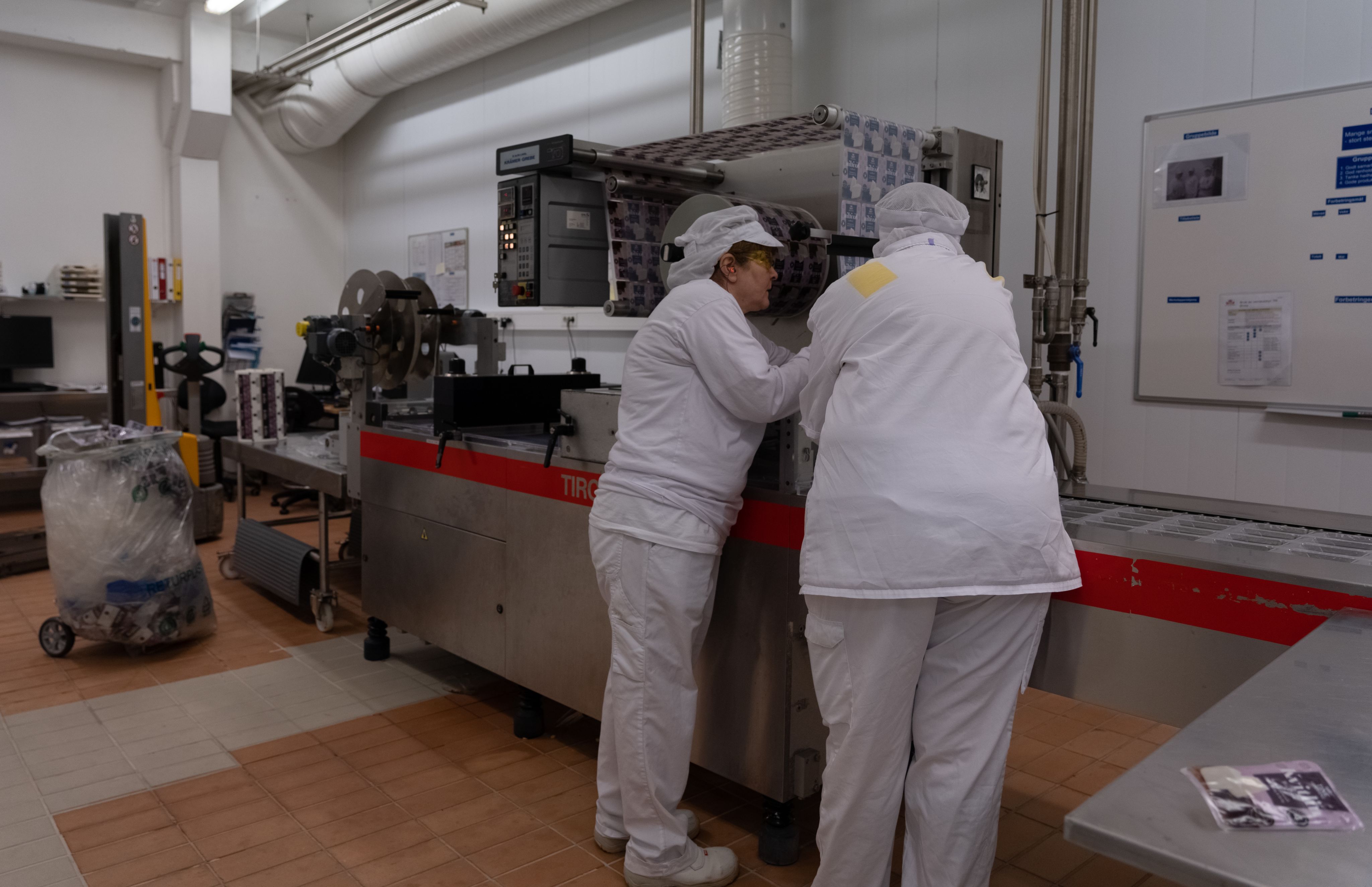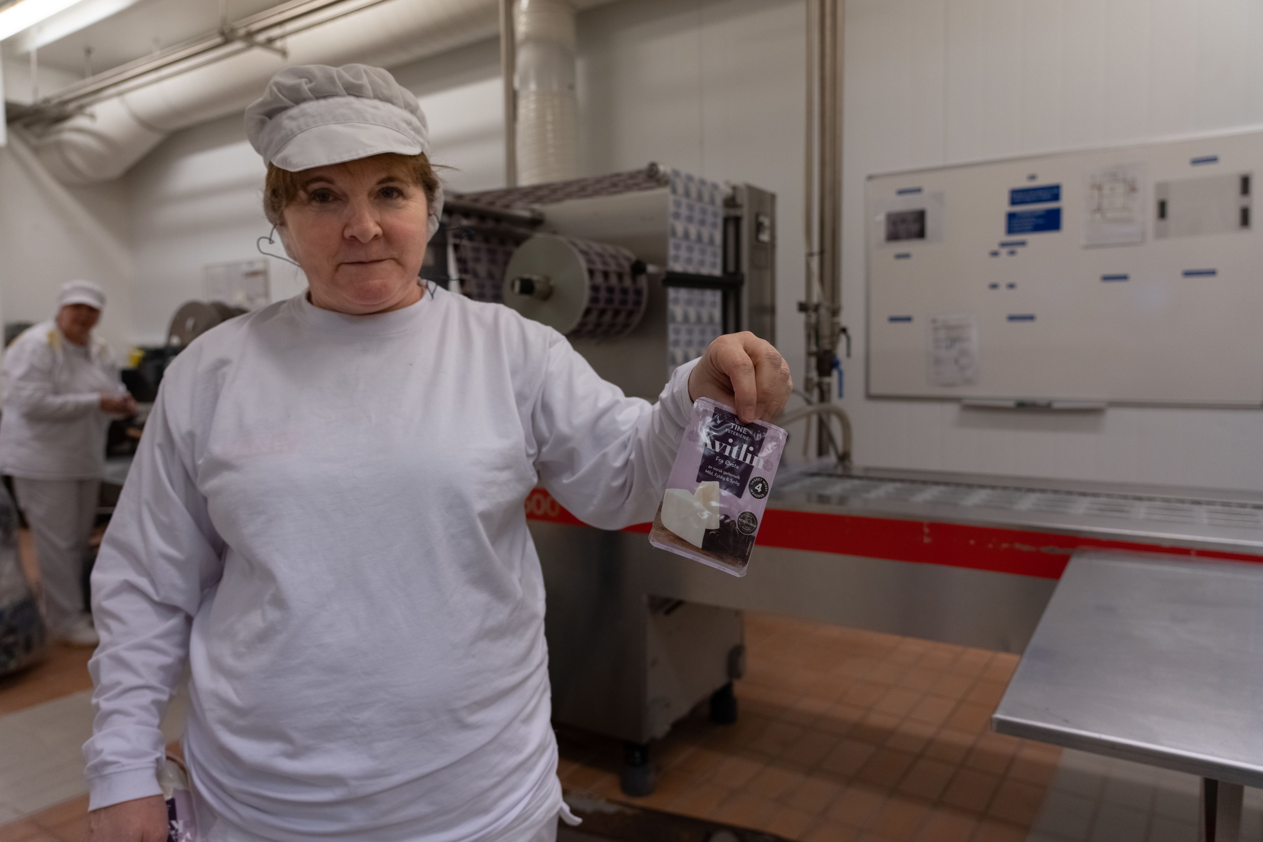 Etter at osten har vore lagra i tre veker, startar pakke-prosessen. Ismeta Deric og Signe Fosse Ryste har ansvar for at pakkinga går som den skal, og er grundige med å justere, slik at emballasjen blir riktig plassert.