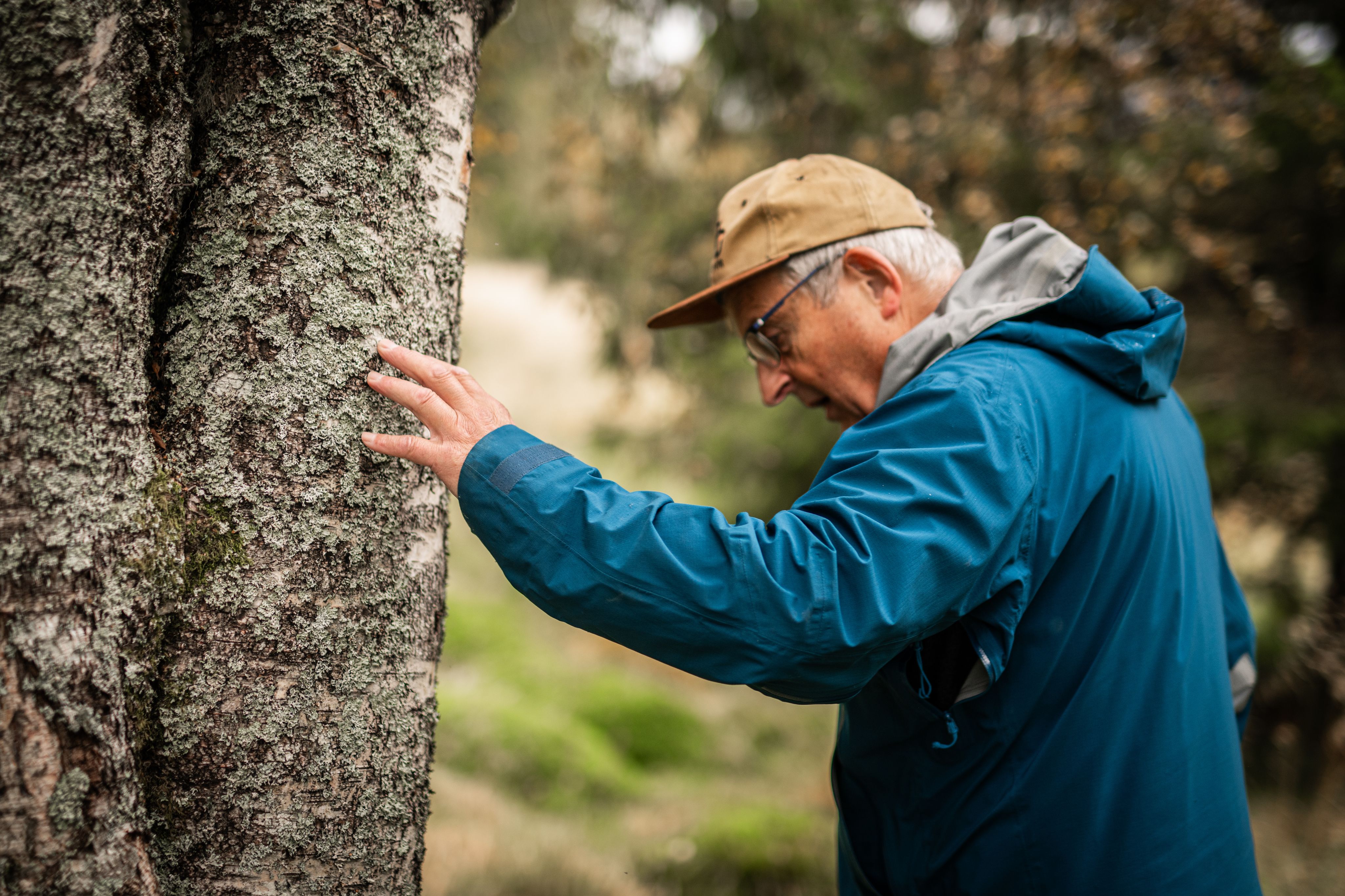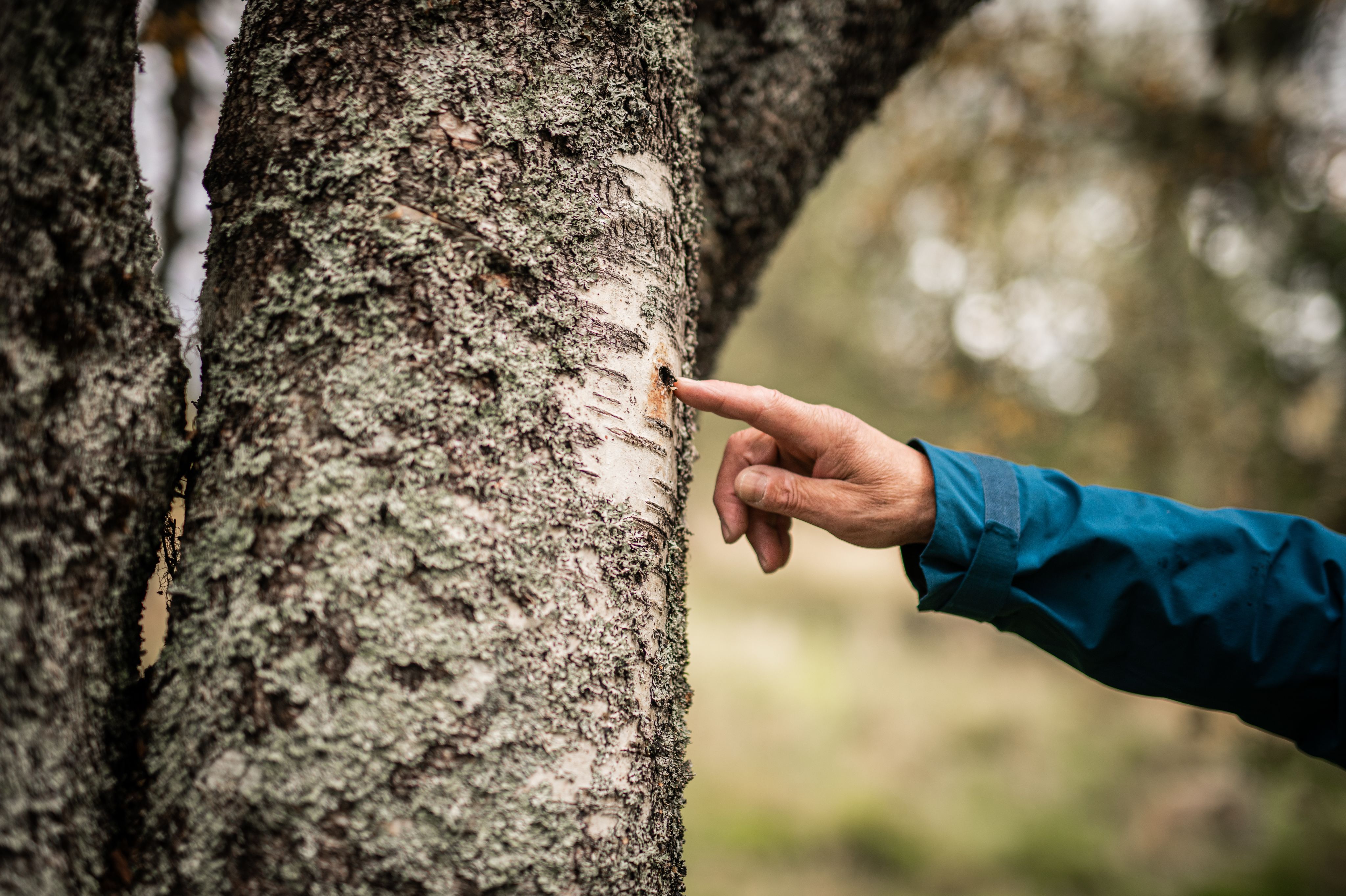 Her har han satt ut sporer av chagasopp, som etterhvert vil gro i trærne. Det er en kraftig antioksidant som brukes i kosttilskudd han selv produserer. Et produkt som er viktig for bedriften hans.