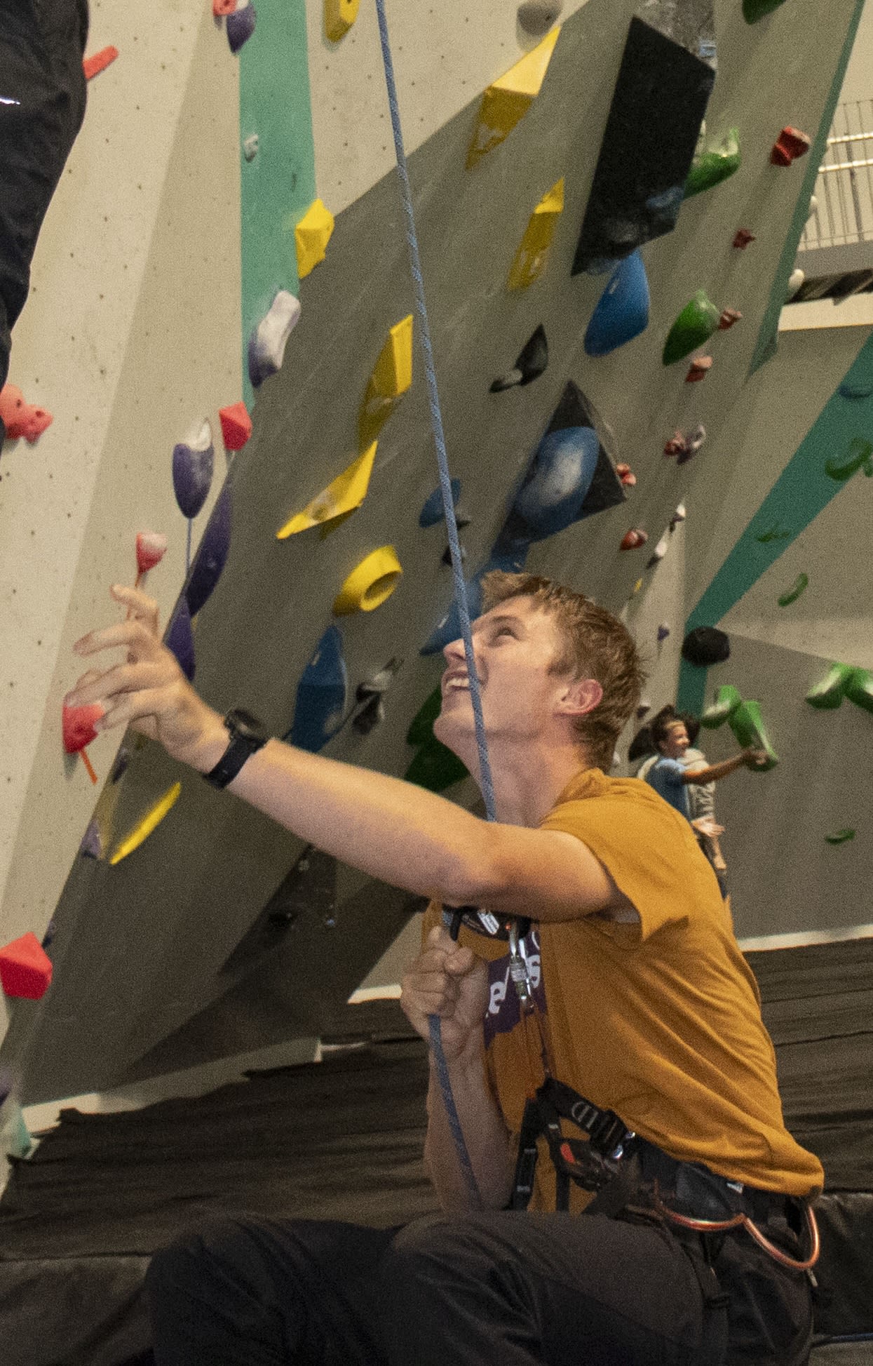 Nå klatrer han likevel til toppen av klatreveggen.