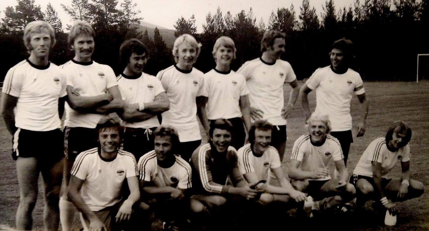 Dette er et bilde av fotballaget til Ørsta IL fra før i tiden. Til venstre står lynvingen Stein Aam.