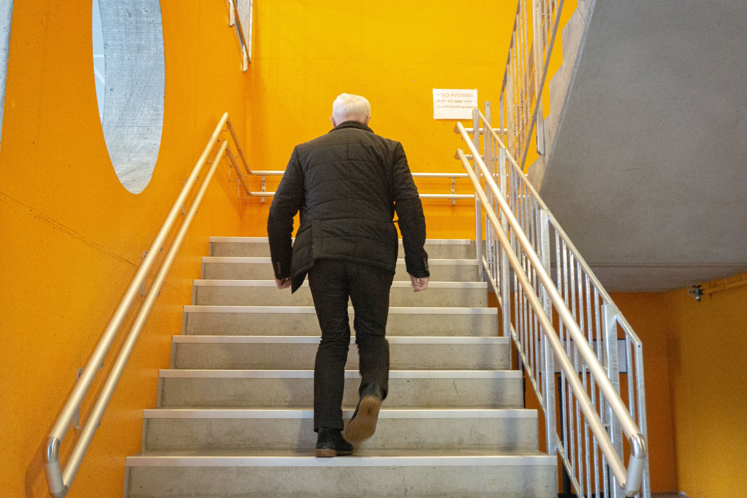 Utenfor det flotte bygget Ørstahallen stopper en Mitsubishi. Ut av bilen stiger en høyreist mann.