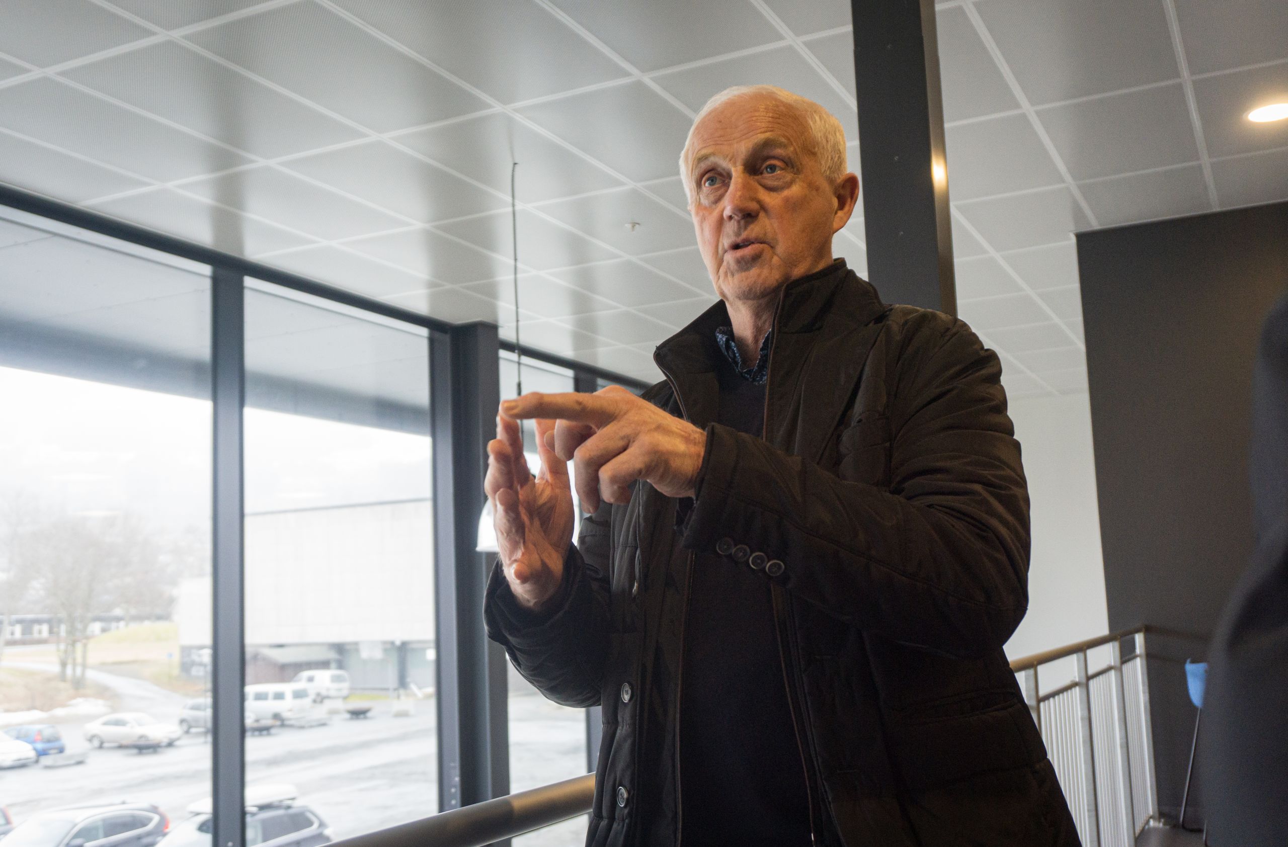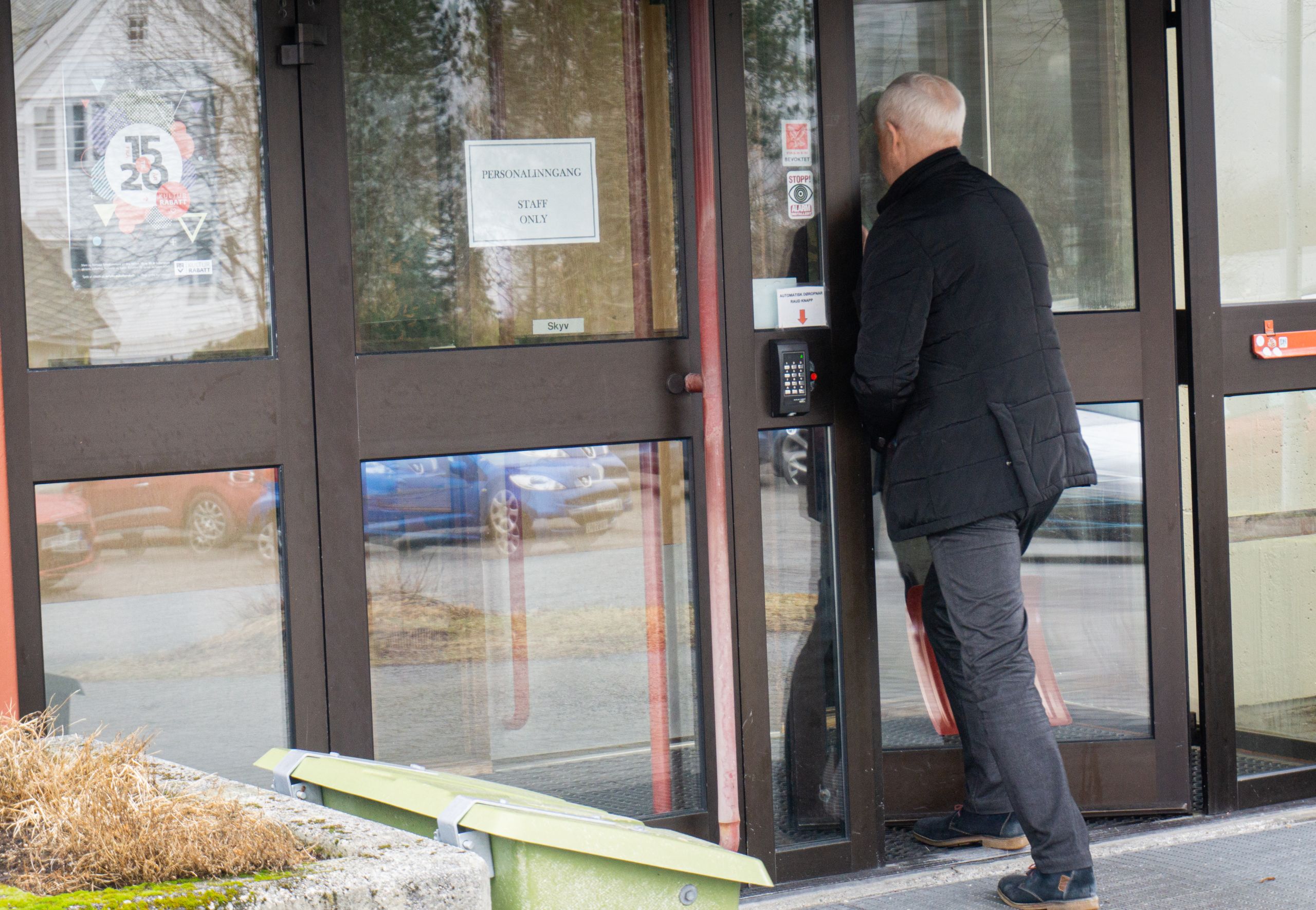 Stein Aam, ordføreren i Ørsta kommune, hilser på oss. Han påpeker at det er bra at vi har på oss munnbind.