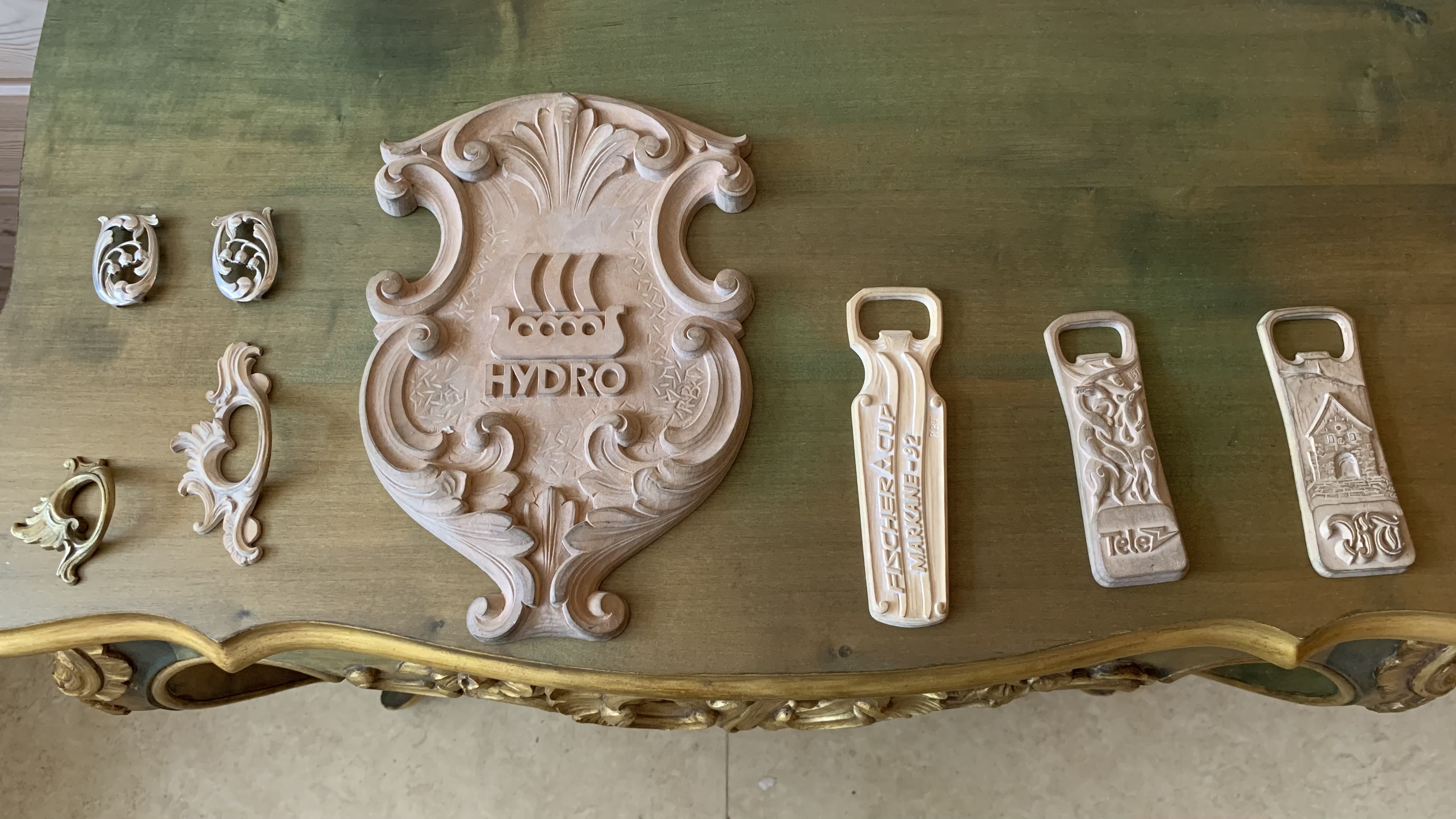 På det mosegrønne rokokko-bordet med 23 karats gullbelagte detaljer kan vi se kopier av et lite knippe av mesteren sine oppdrag. Oppe til venstre en del av ordførerkjedet til Volda, som han først skjærte ut før han så fikk det sandstøpt.