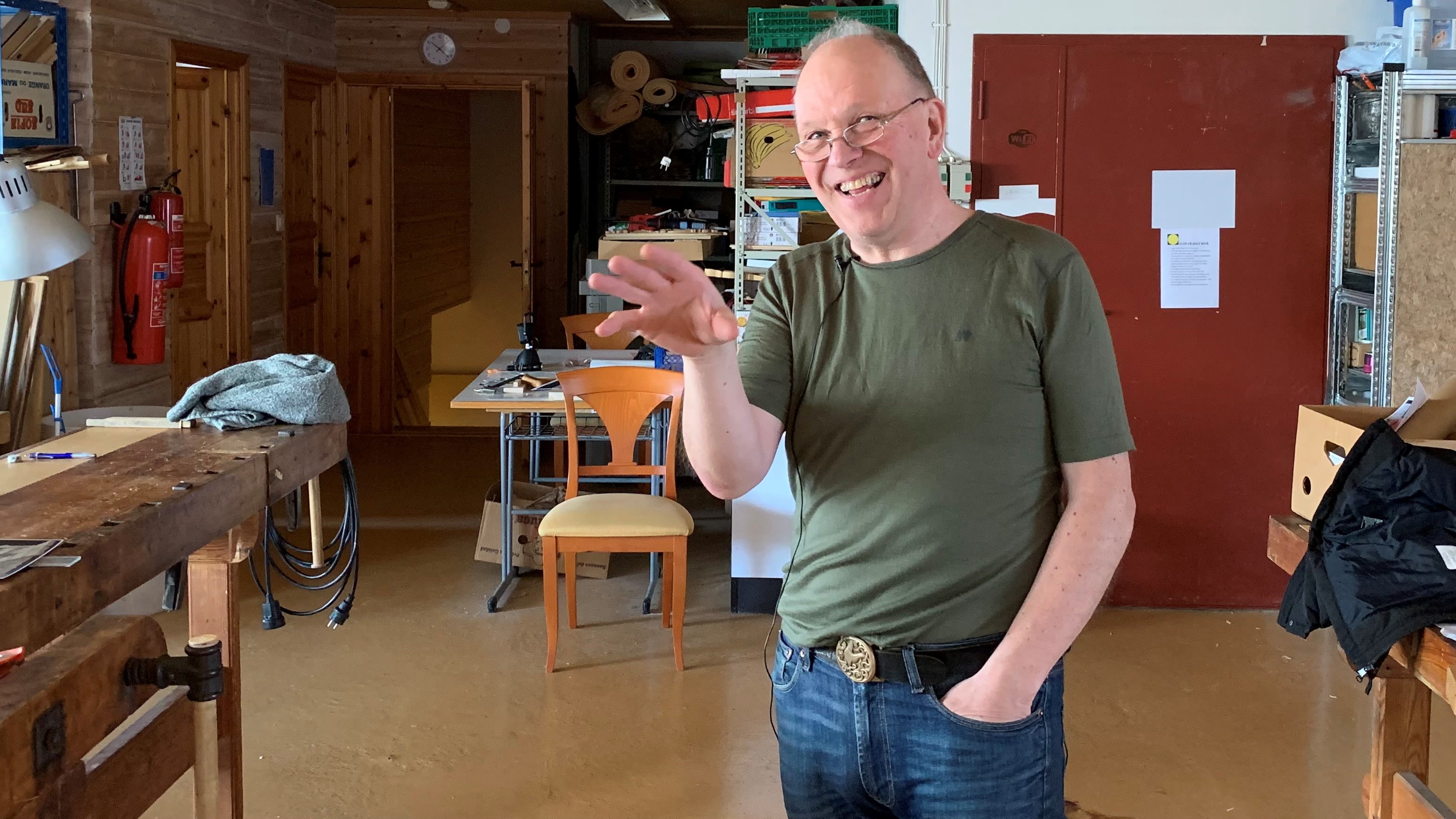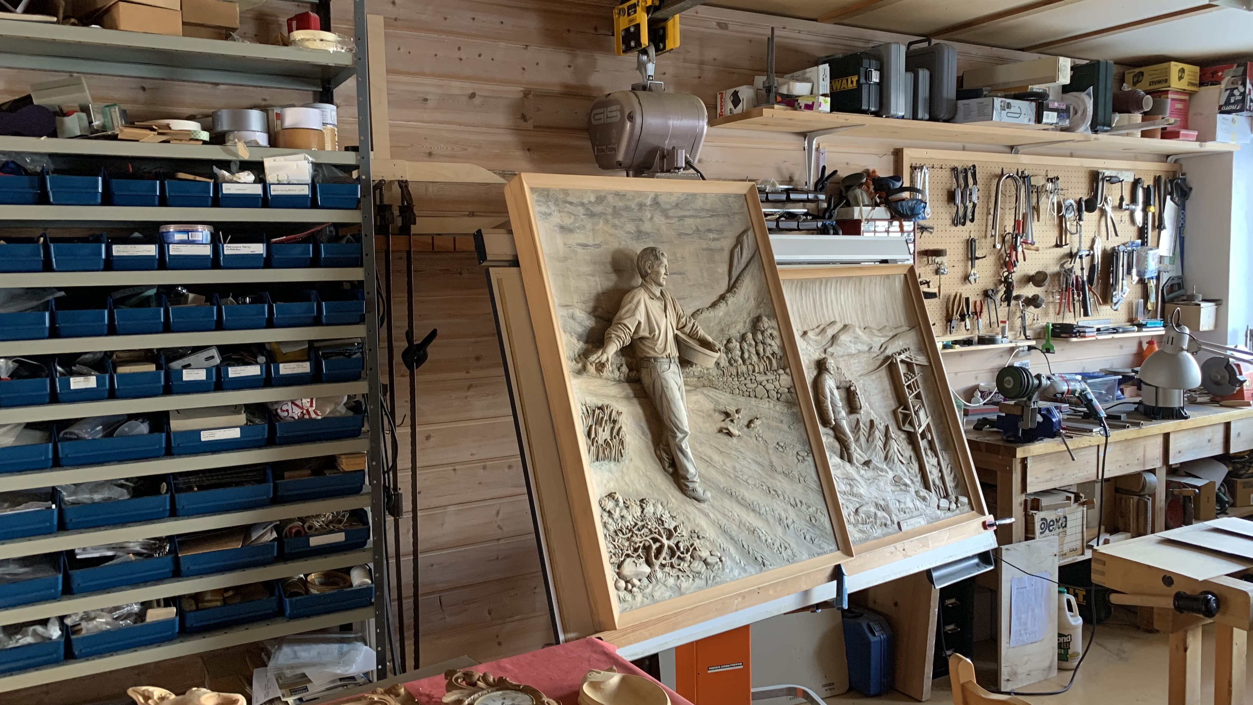 Dette er Rolf sitt verksted i Hornindal. Her utfører han det meste av sine oppdrag, utvikler hobbyen sin og holder kurs året rundt - totalt har han hatt omlag 1500 deltagere.