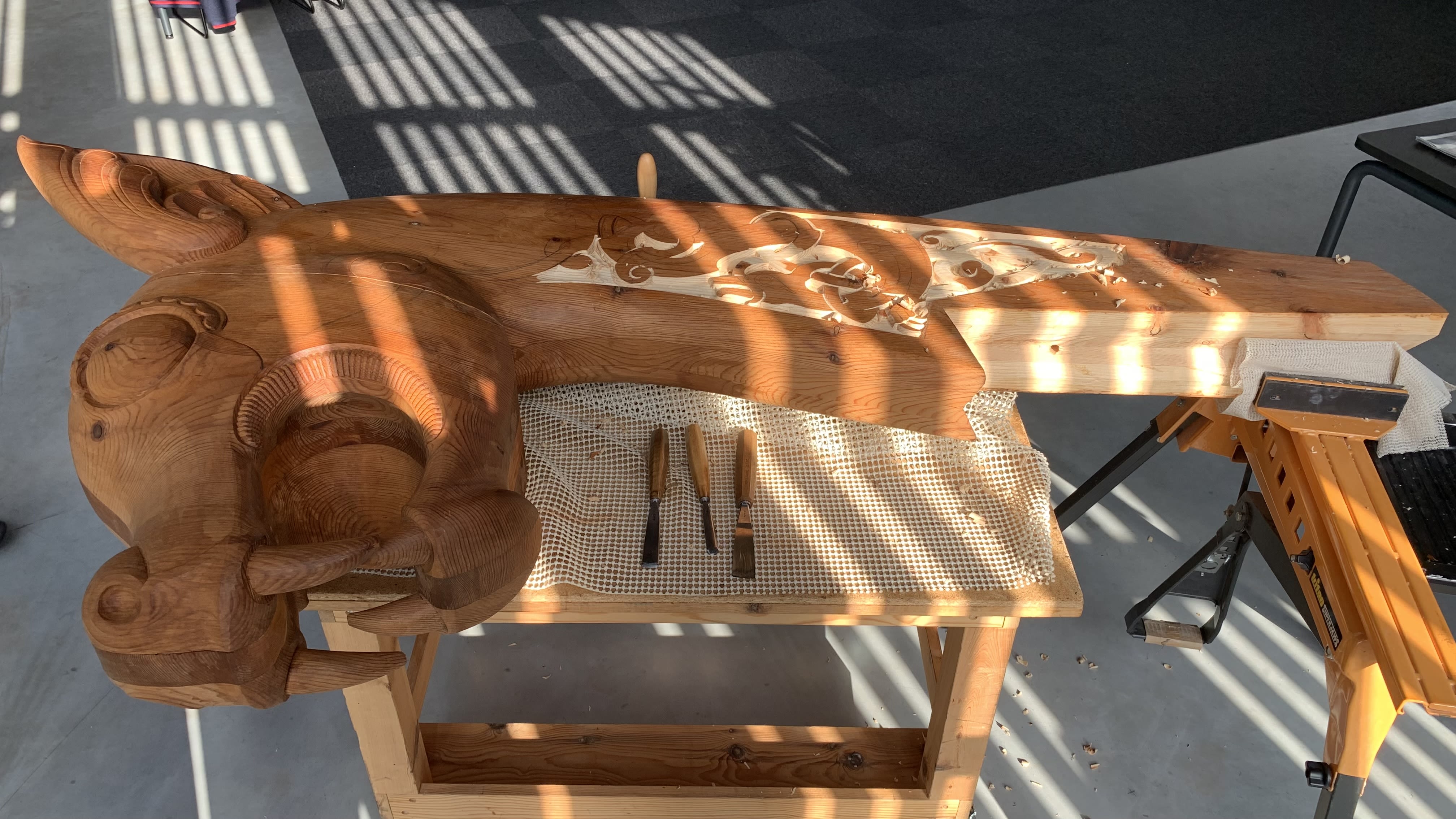 For at konstruksjonen skal tåle belastningen av stormfulle hav har han valgt ut treemnene nøye. Hodet består av tre ulike deler tre som er laminert sammen. Emnene er fra skogen rett ved hans verksted og Bjørkedalen.